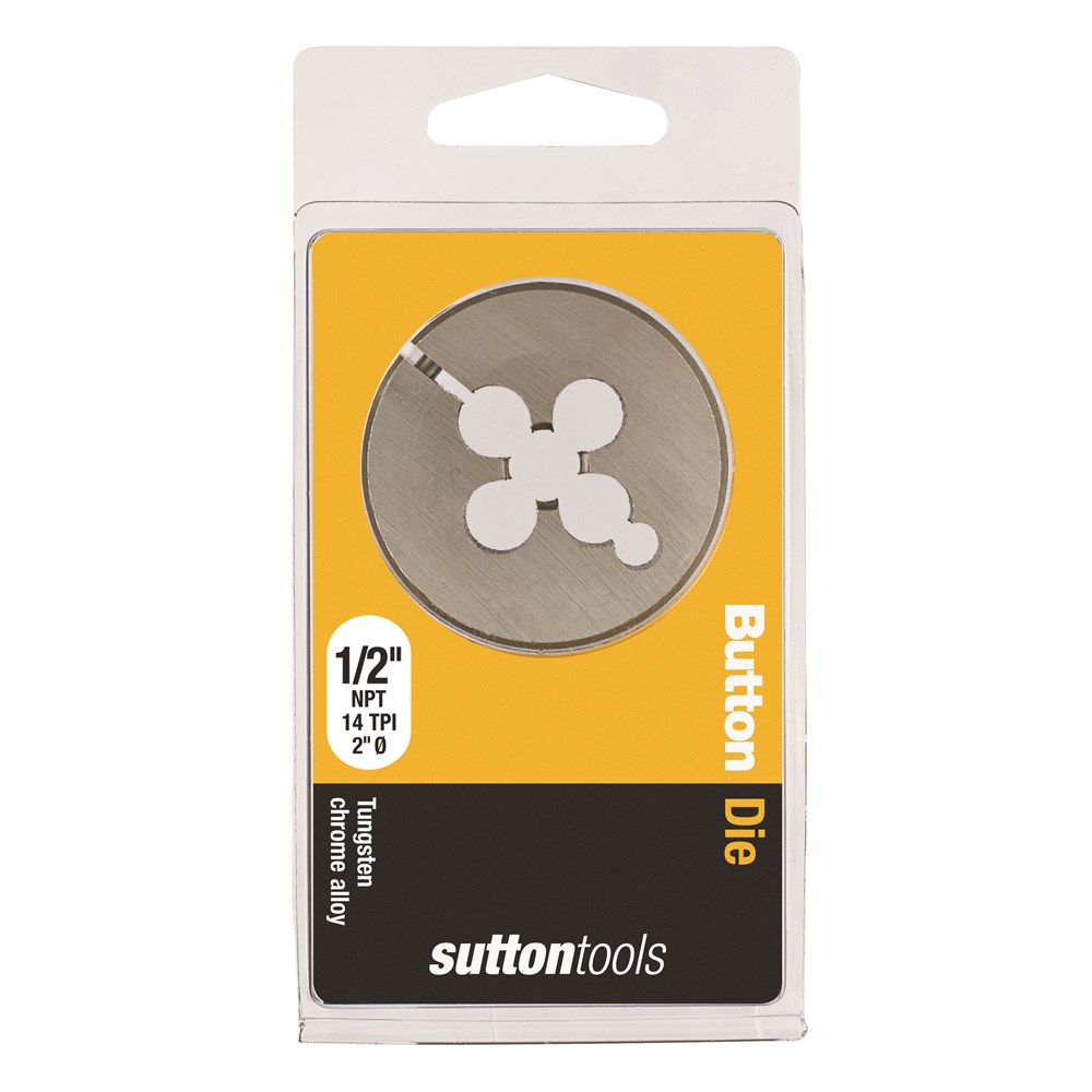 Sutton Carbon Button Dies, NPT, 2" OD. A Button Die is used for cutting a new male/external thread on studs. Made from Tungsten Chrome Alloy these Button Dies and are not suitable for precision, safety or critical thread but are ideal for general purpose and DIY use in non-ferrous metals & plastics. This solid round die fits into an adjustable guide or plain dies stock handle.