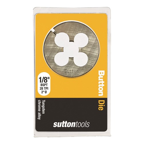 Sutton Carbon Button Dies, BSPT, 2" OD. A Button Die is used for cutting a new male/external thread on studs. Made from Tungsten Chrome Alloy these Button Dies and are not suitable for precision, safety or critical thread but are ideal for general purpose and DIY use in non-ferrous metals & plastics. This solid round die fits into an adjustable guide or plain dies stock handle.