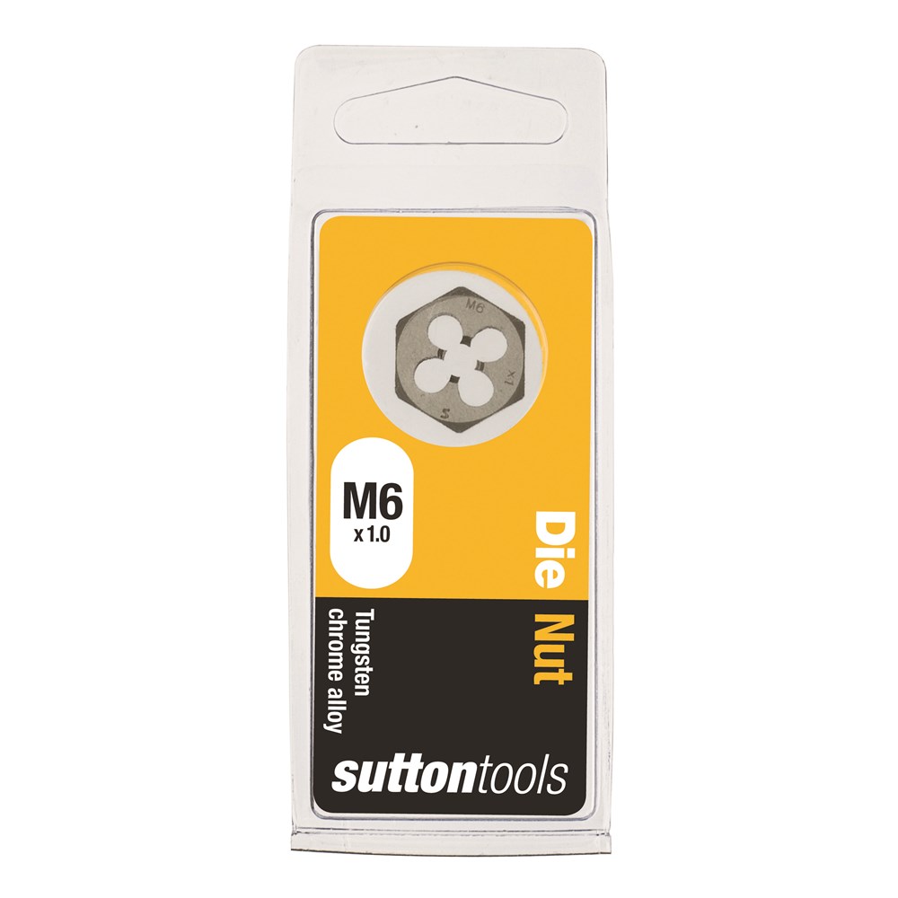 Sutton Carbon Die Nuts, Metric. A Die Nut is designed for cleaning and resizing existing damaged threads. Made from Tungsten Chrome Alloy these Die Nuts and are not suitable for precision, safety or critical thread but are ideal for maintenance, repair work and general purpose use in non-ferrous metals & plastics. This hexagonal die can be used with a wrench or socket in limited space.