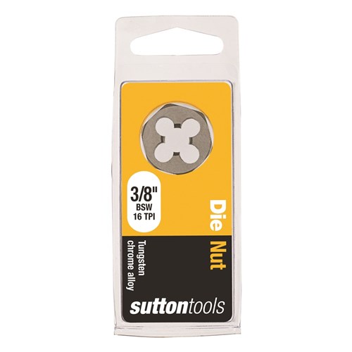 Sutton Carbon Die Nuts, BSW. A Die Nut is designed for cleaning and resizing existing damaged threads. Made from Tungsten Chrome Alloy these Die Nuts and are not suitable for precision, safety or critical thread but are ideal for maintenance, repair work and general purpose use in non-ferrous metals & plastics. This hexagonal die can be used with a wrench or socket in limited space.