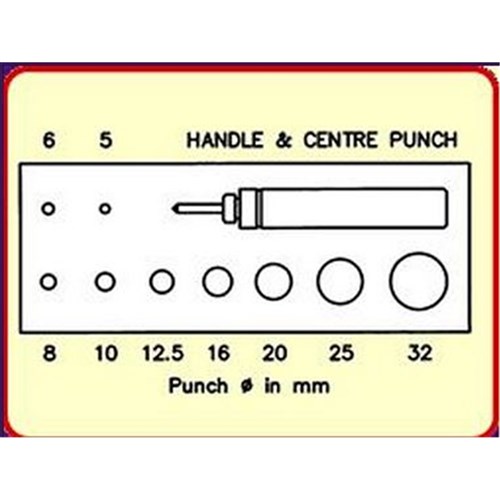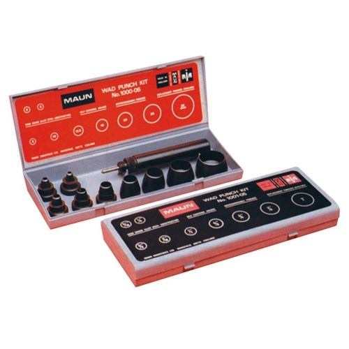 Maun Metric Wad Punch Kit. Features 9 interchangeable punches from 5 to 32mm diameter with a handle and centre punchassembly. Packed in plastic case.