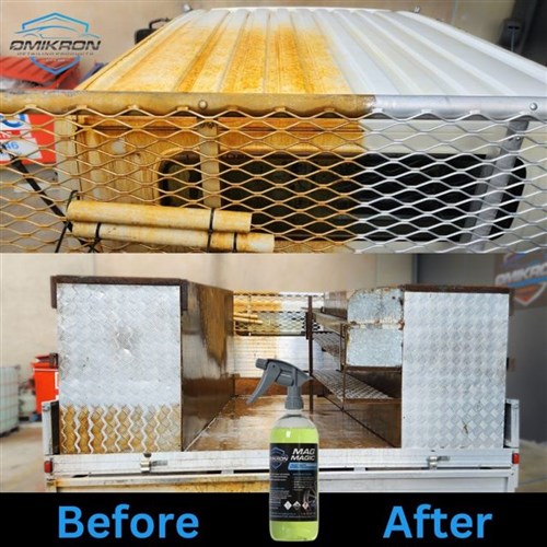 Omikron Mag Magic Acid Cleaner is an extremely powerful, fast-acting wheel cleaner that makes scrubbing a thing of the past. Just apply and watch it effortlessly dissolve grease and grime from even the most heavily soiled truck wheels. Its concentrated formula is perfect for cleaning mag wheels and aluminium surfaces, but it’s not suitable for polished metals. The 1L bottle comes pre-mixed and ready to use, while other sizes require dilution according to instructions. Mag Magic’s incredible cleaning power is showcased in real-life results—no scrubbing required, just brilliant, clean wheels.