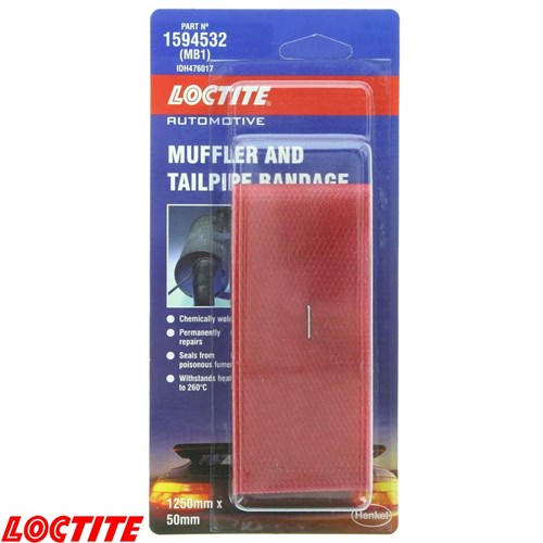 Loctite muffler and tailpipe bandage chemically welds for permanent repair. Handles temperatures up to 260 DegreesC
