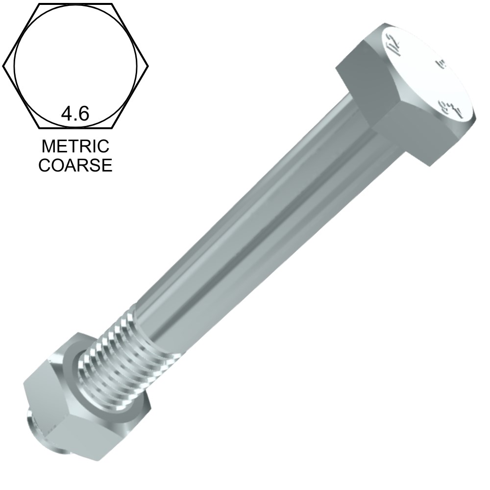 ISO Metric Coarse Class 4.6 Hex Head Fastener, ISO Metric coarse pitch thread to (AS1111.1/AS1111.21/AS4291.1). Supplied as Zinc Plated Bolt & Nut Assembly, can be purchased each or in box quantities.