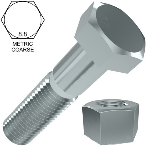 ISO Metric Coarse Class 8.8 Hex Head Fastener, ISO Metric coarse pitch thread to (AS1110.1/AS1110.2/AS4291.1). Supplied as Zinc Plated Bolt & Nut Assembly, can be purchased each or in box quantities.
