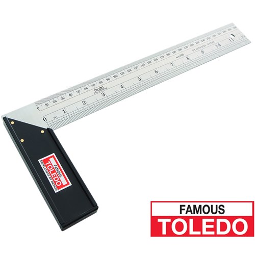 Carpenter's Mitre Squares Metric & English. Used for producing right angles in carpentry. Stainless steel blade with reinforced plastic handle. Graduated blade with metric and SAE markingsFeatures hanger hole in blade. Suitable for use as inner or outside try square, mitre square. horizontal, 45 degree marking gauge and rule. Manufactured from stainless steel