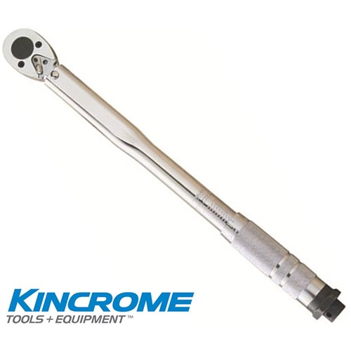 KIncrome micrometer torque wrench. 3/8 square drive, with reversible ratchet head. The Ft/lb. and Nm scale is engraved on the barrel of the wrench. The Micrometer type sleeve allows accurate pre-set torque levels to be set. When torque is reached the wrench produces an audible click and a release of tension. Triple scale torque wrench 5 - 80 Ft-lb, 6.8 - 108.5 Nm. Easy locking Easy grip handle Contents:- 3/8 Drive Ratchet. Packaged in a blow mould case.