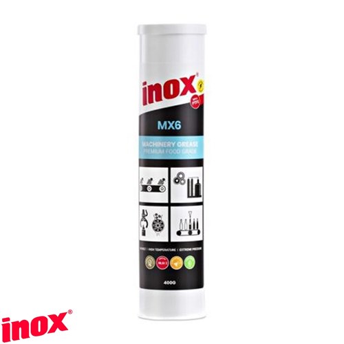INOX MX6-400 is a high-performance synthetic extreme pressure grease, NSF Class H1 food-grade approved, ensuring safe use for incidental food contact in processing environments. Formulated with bentone, PTFE, and polyalphaolefins, this grease provides superior protection under high-pressure conditions while maintaining reliable lubrication at elevated temperatures. Designed to resist water washout, INOX MX6-400 performs exceptionally well in wet or humid environments. It is ideal for lubricating bearings, bushes, chains, hinges, sprockets, slides, splines, and universal joints in various types of machinery, and is perfect for use in food processing equipment, beverage filling lines, conveyor systems, and packaging machines. It also operates effectively in cold environments such as freezers and cold rooms.