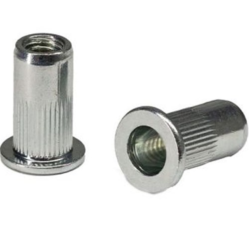 Ribbed rivet nuts offer additional torque strength over standard rivet nuts due to their knurled expansion surface. Rivet nuts are also available with flush-mounting heads.