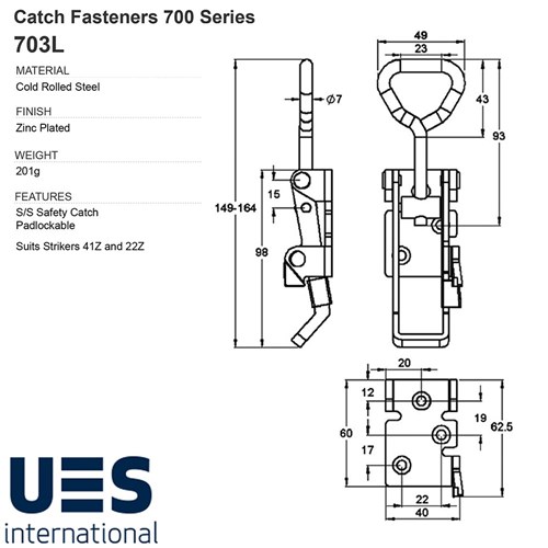 The UES 700 series over centre latch is desiged for positive retaning on lids, doors or many other uses. This latch style is adjustable and lockable and comes with a catch plate ready to install.