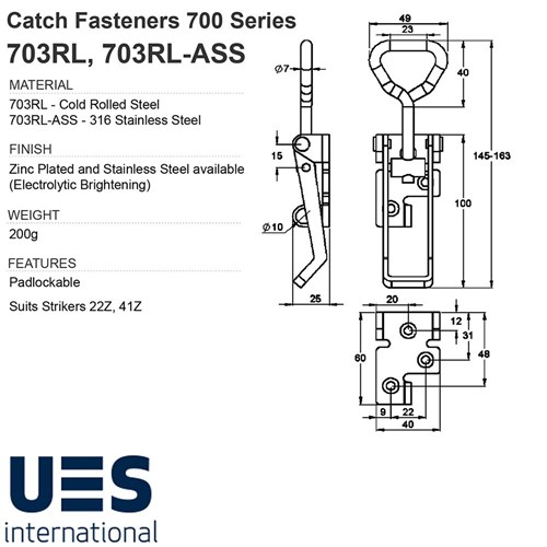 The UES 700 series over centre latch is desiged for positive retaning on lids, doors or many other uses. This latch style is adjustable and lockable and comes with a catch plate ready to install.