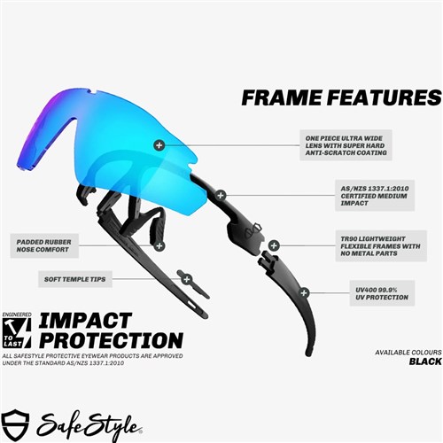 SafeStyle Phantoms are the future of high-performance, sports-style safety glasses. Certified to AS/NZS 1337.1, they deliver exceptional protection and style. Featuring an ultra-lightweight TR90 frame, these glasses are incredibly durable, flexible, and comfortable, weighing only 30 grams. The wrap-around design offers full coverage, while shatterproof lenses provide ultra-wide vision and block 99.9% of UV rays.