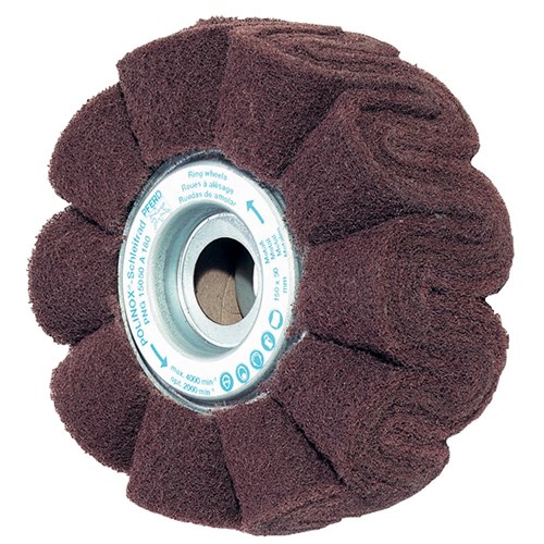 This 150mmx50mm mounted PoliNox wheel uses 'scotchbrite like' material with 100 grit abrasive grains to leave a matt or satin finish with minimal signs of transitions. To be used on stainless steel