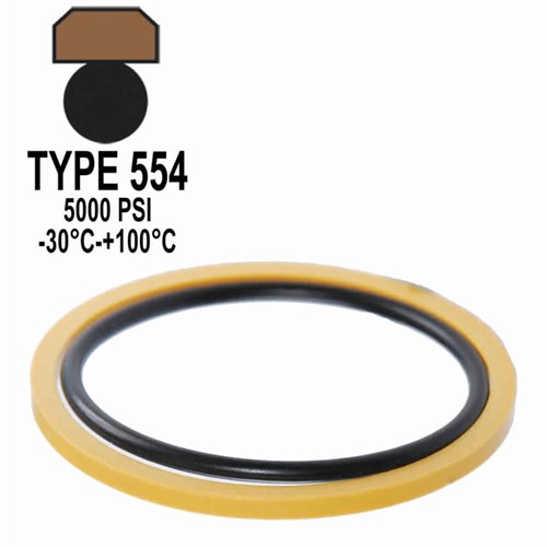 The Hallite 54 double acting piston seal provides the designer with a compact, low friction seal for light to medium duty hydraulic cylinders. It comprises a PTFE ring, strengthened with additives to resist creep, which is pre-loaded by an O ring to be effective for the operating pressure range recommended. As the pressure rises the O ring deforms and compresses the PTFE ring against the tube wall increasing the sealing force and the effectiveness of the seal. As only the PTFE ring is in contact with the sliding surface, friction is very low and stick-slip movement is eliminated. The housing width allows the designer to use a narrow width piston, but it is recommended an adequate bearing is mounted on either side of the seal as shown*