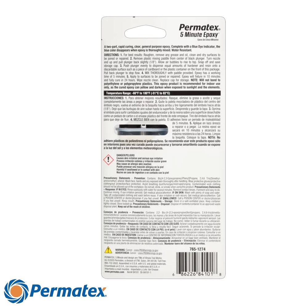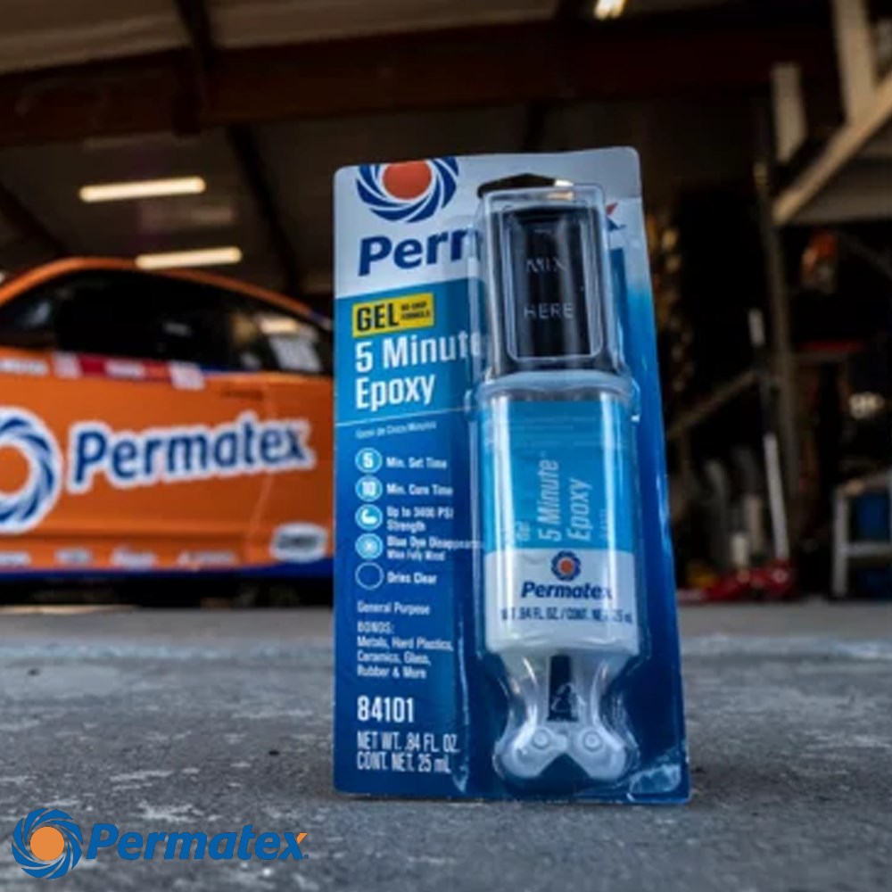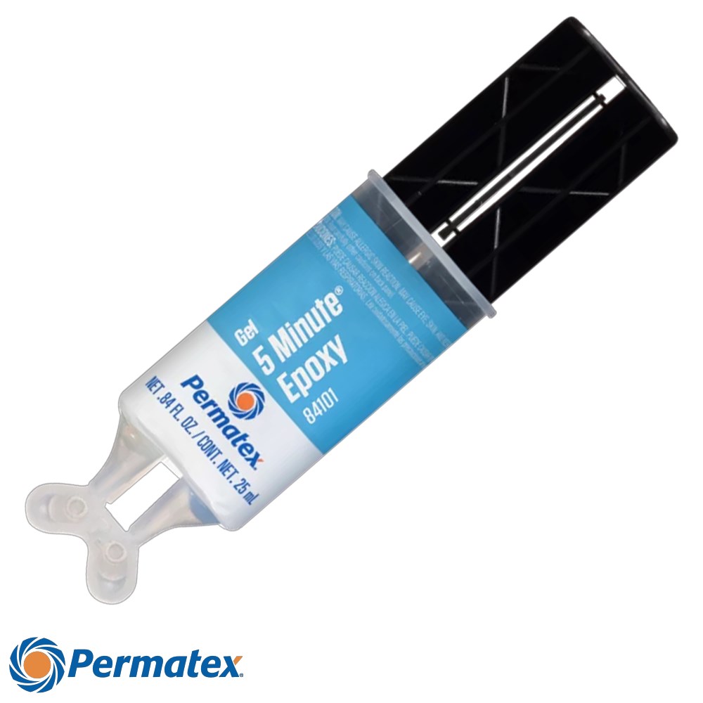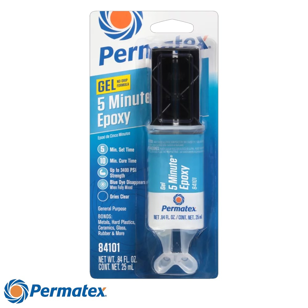 Fast, Strong, and Mess-Free Bonding, Permatex 5 Minute Epoxy Gel is a quick-setting, two-part adhesive ideal for general-purpose repairs and assemblies. Its advanced gel formula reduces mess and waste, while the blue dye indicator disappears when fully mixed—so you know exactly when it’s ready to use. Perfect for bonding rigid materials, it dries clear, delivers permanent strength, and requires no clamping.