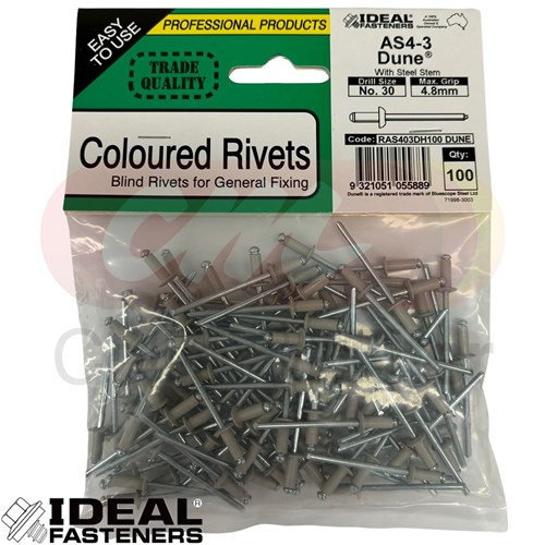 These multi-purpose rivets are ideal for general fastening in light to medium-duty applications. The aluminium body offers corrosion resistance, making them suitable for both indoor and outdoor use. They are painted to match the popular pre-painted colours of metal roofing, cladding, and fencing profiles.
