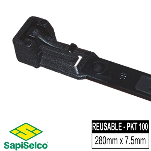 Reusable Cable tie black 280mm long by 7.5mm wide. Supplied in a handy bag of 100.