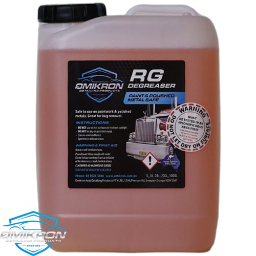 RG degreaser is designed for use on on paint, polished metals and alloy on truck tanks, bar work, Alcoa wheels, paintwork etc. Also used a lot on plant machinery and buses and comes ready to use. There is no risk for damage. Also a great bug remover.