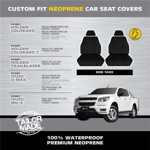 Made from 100% waterproof premium neoprene, these covers are tailored to fit your vehicle perfectly, ensuring they stay secure. The 16oz automotive-grade neoprene, with an additional 5mm bonded foam layer, provides exceptional comfort, while the heavy-duty Neotex material on the sides, skirt, and back guarantees durability. Full functionality of your seats is retained with split folds, seatbelt holes, and airbag compatibility on both sides. Featuring a rear map pocket for essentials and a D-ring fitting system for quick, knot-free installation, these covers are tradie-tough and built to last. Backed by a 3-year guarantee, they offer complete seat protection, including headrests.