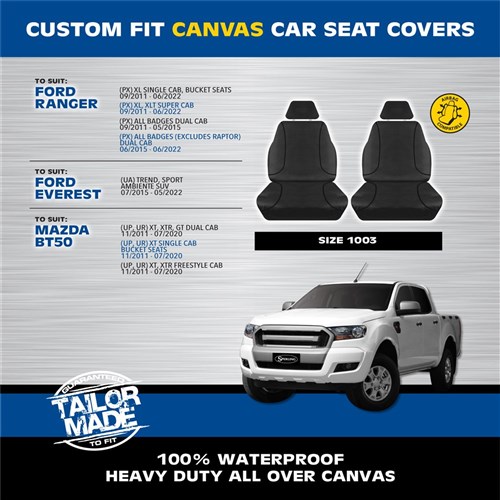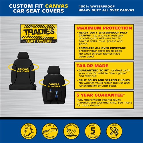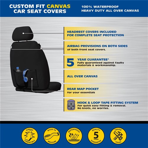 TRADIES Custom Fit Canvas Car Seat Covers are built tough to handle the demands of hard work. Made from 100% waterproof heavy-duty poly canvas, they offer rip and tear resistance, creating a solid barrier against spills, mud, grease, and grime. These covers provide complete all-over protection for your seats, without using any weak stretch fabrics. Tailor-made to fit your vehicle perfectly, they feature split folds and seatbelt holes to ensure full seat functionality and airbag compatibility on both sides. With a 5-year guarantee against faulty materials and workmanship, they’re designed to last. The headrest covers and rear map pocket offer added protection and convenience, while the hook and loop tape fitting system makes installation and removal quick and easy. Tradie-tough and made to measure for complete confidence.