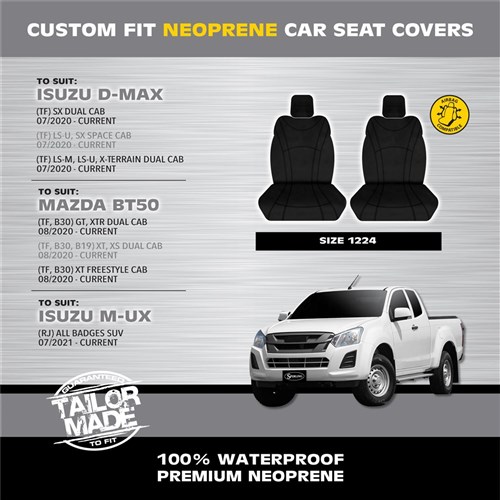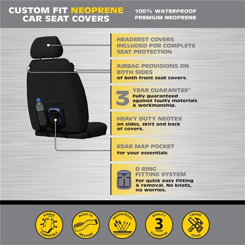 Made from 100% waterproof premium neoprene, these covers are tailored to fit your vehicle perfectly, ensuring they stay secure. The 16oz automotive-grade neoprene, with an additional 5mm bonded foam layer, provides exceptional comfort, while the heavy-duty Neotex material on the sides, skirt, and back guarantees durability. Full functionality of your seats is retained with split folds, seatbelt holes, and airbag compatibility on both sides. Featuring a rear map pocket for essentials and a D-ring fitting system for quick, knot-free installation, these covers are tradie-tough and built to last. Backed by a 3-year guarantee, they offer complete seat protection, including headrests.