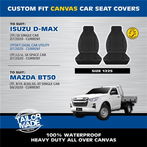 TRADIES Custom Fit Canvas Car Seat Covers are built tough to handle the demands of hard work. Made from 100% waterproof heavy-duty poly canvas, they offer rip and tear resistance, creating a solid barrier against spills, mud, grease, and grime. These covers provide complete all-over protection for your seats, without using any weak stretch fabrics. Tailor-made to fit your vehicle perfectly, they feature split folds and seatbelt holes to ensure full seat functionality and airbag compatibility on both sides. With a 5-year guarantee against faulty materials and workmanship, they’re designed to last. The headrest covers and rear map pocket offer added protection and convenience, while the hook and loop tape fitting system makes installation and removal quick and easy. Tradie-tough and made to measure for complete confidence.