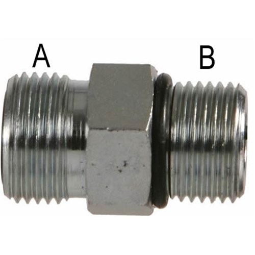 Hydraulic ORFS Male/UNO Male Straight Nipple (Union). High pressure zinc plated adaptor complete with O-Rings.