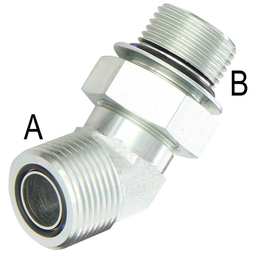 Hydraulic ORFS Male/UNO Male 45 Degree elbow. High pressure plated steel complete with O-rings.