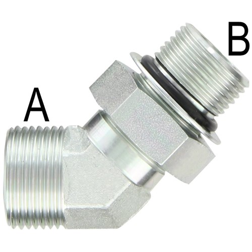 Hydraulic ORFS Male/UNO Male 45 Degree elbow. High pressure plated steel complete with O-rings.