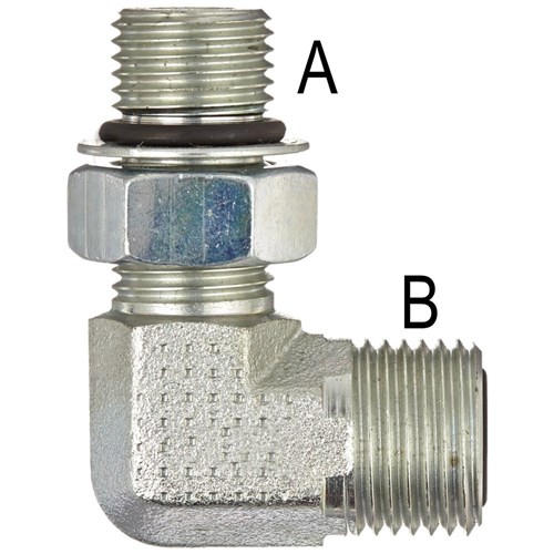 Hydraulic ORFS Male/UNO Male 90 Degree elbow. High pressure zinc plated steel adaptor. Complete with O-Rings.