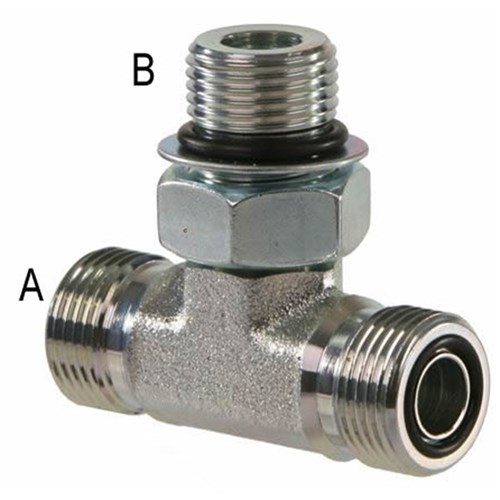 Hydraulic ORFS/UNO Tee. Male / Male / Male. High pressure zinc plated steel adaptor. Comes complete with O-rings.