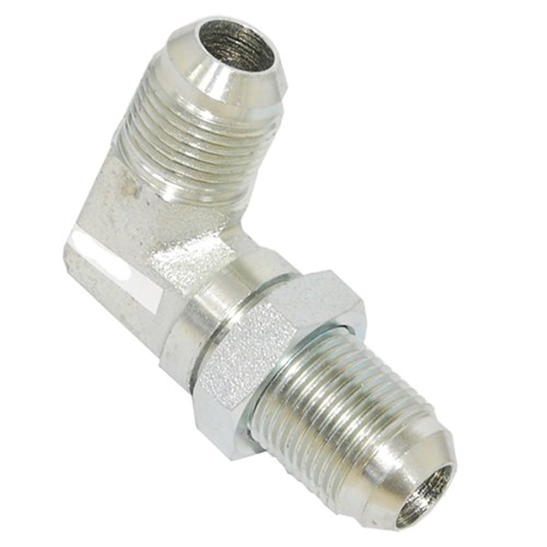 Hydraulic JIC 37 Degree Male Bulkhead 90 Degree elbow. Zinc plated high pressure steel fitting. Complete with bulkhead nut.