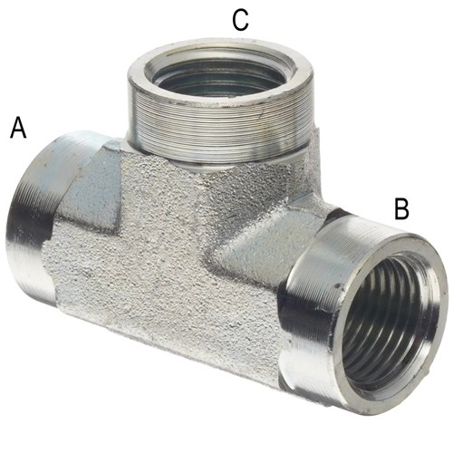 Hydraulic BSPT Fixed Female Tee. High pressure zinc plated steel adaptor.