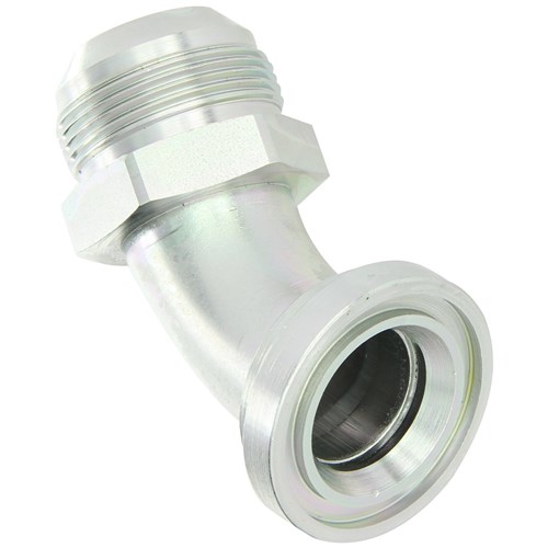 Hydraulic Code 62 Flange/JIC 37 Degrees Male 45 Degrees elbow. Plated high pressure steel. Use R90214 O-Ring.