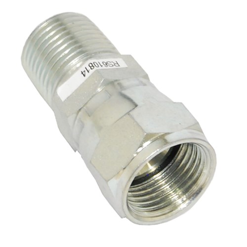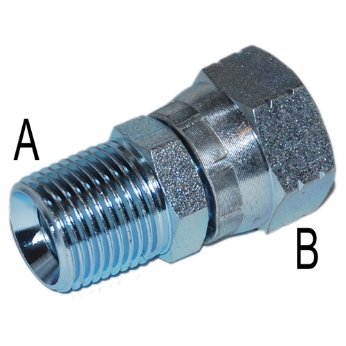 Hydraulic BSPT Male/JIC 37 Degree Swivel Female straight adaptor. High pressure zinc plated steel fitting.