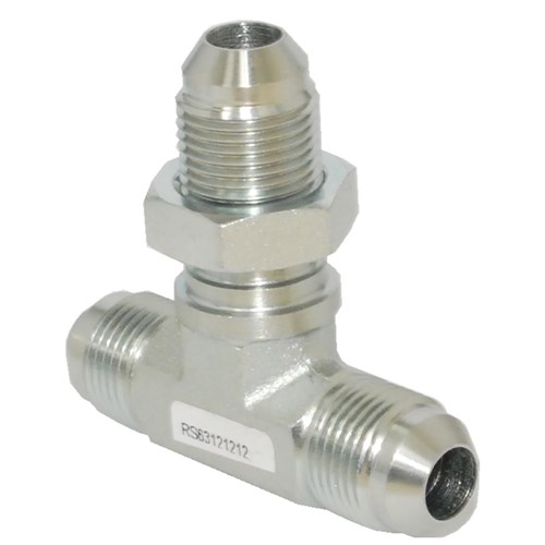 Hydraulic JIC 37 Degree Male bulkhead tee. High pressure zinc plated steel adaptor. Comes with bulkhead locknut.