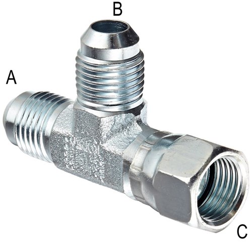 Hydraulic JIC 37 Degree Swivel nut running tee. High pressure zinc plated steel adaptor.