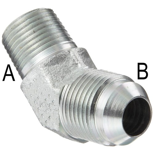 Hydraulic BSPT Male/JIC Male 45 Degree elbow. High pressure zinc plated steel adaptor.