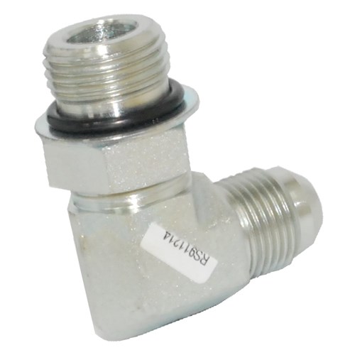 Hydraulic JIC Male/UNO Male 90 Degree elbow. High pressure zinc plated steel adaptor. Complete with O-Ring.