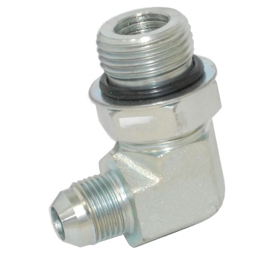 Hydraulic JIC Male/UNO Male 90 Degree elbow. High pressure zinc plated steel adaptor. Complete with O-Ring.