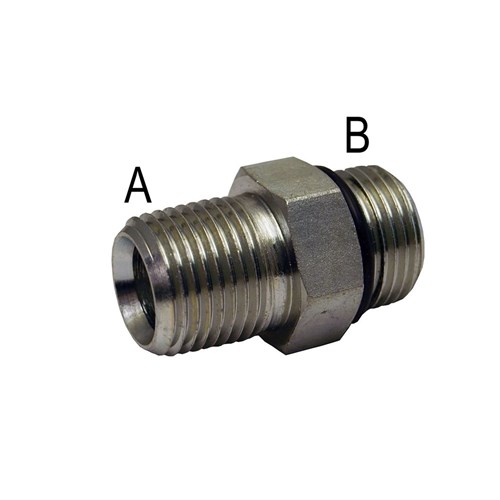 Hydraulic BSPT Male/UNO Male Straight Nipple (Union). High pressure zinc plated steel adaptor complete with O-Ring.