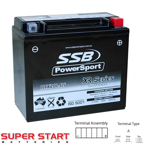 Super Start motorcycle battery LH20L-BS. SSB PowerSport AGM motorcycle batteries are an extremely high performance designed for starting applications and are a completely sealed battery making them spill-proof and leak-proof.
