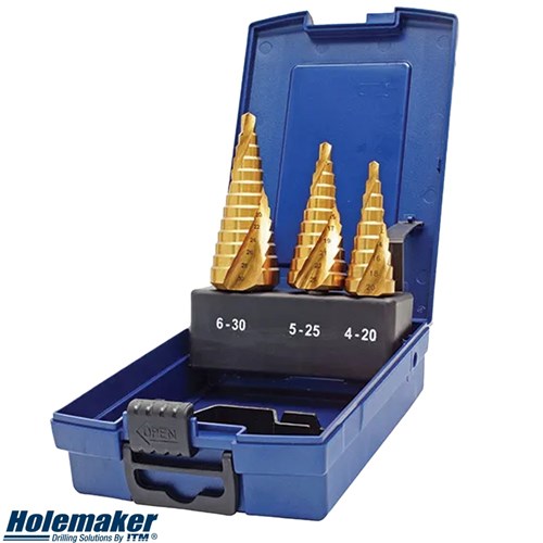 The Holemaker Spiral Flute Step Drill is a 3 Piece Set.