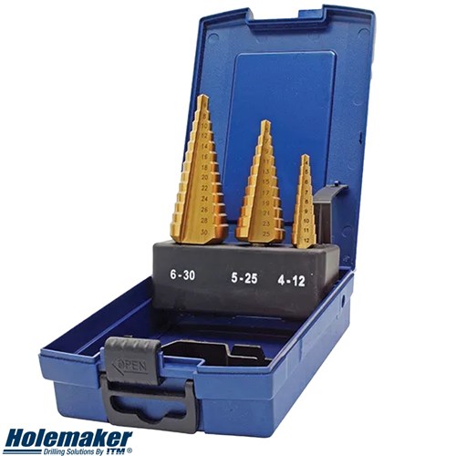 The Holemaker Straight Flute Step Drill is a 3 Piece Set with Titanium Nitride coating which significantly increases the tool life.