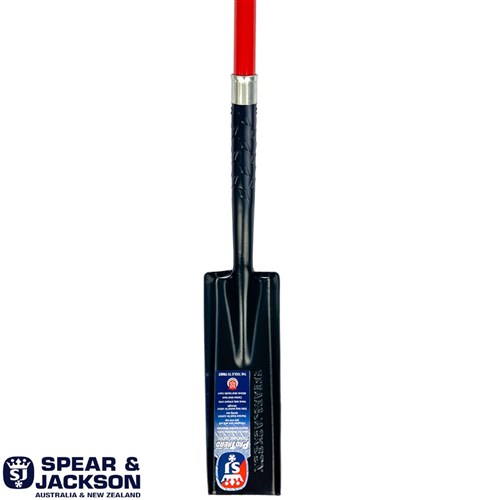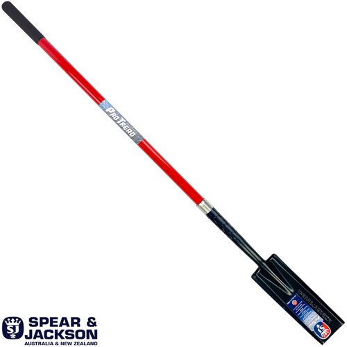 The Spear & Jackson ProTread Trenching Shovel is specifically designed for digging trenches, drains, and other narrow tasks. It comes with a 400mm steel core insert that provides exceptional strength, along with a high-quality fiberglass shaft featuring a soft grip cap for added comfort. The shovel is pressure tested to withstand over 110kg of downforce, ensuring it can handle tough digging jobs. Its powder-coated carbon steel head offers excellent corrosion protection and reduced soil adhesion, making it durable and easy to clean. An oversized tread provides added comfort, while the extra-long socket and heavy-duty crimped collar deliver superior strength and long-lasting durability.