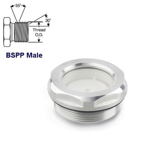 Threaded oil level indicator, hex head with shoulder, made from high density, transparent polymide resin with a 'hot painted' red point in the centre and a contrast screen for clear indication of oil levels. Maximum pressure 3 bar (43 Psi).
