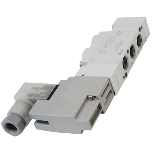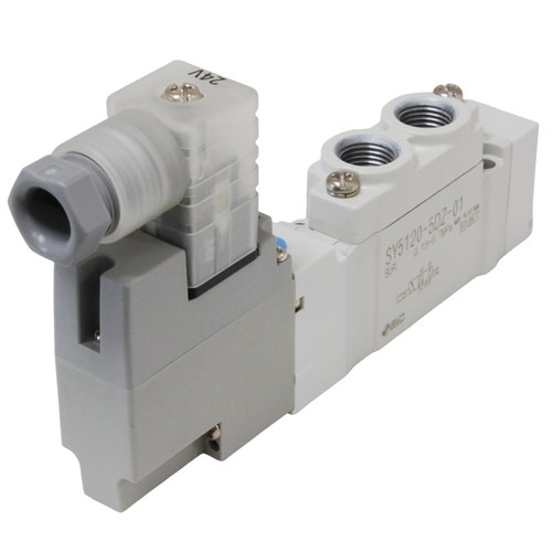 SMC® SY5120-6DZ-01 designed to control pneumatic actuators. Configured to extend and retract cylinders and is set up as a 5 port x 3 position (extend/retract/hold). Its primary use is to stop or hold a cylinder mid-stroke, or allow it to "creep," rather than just fully extending or retracting.