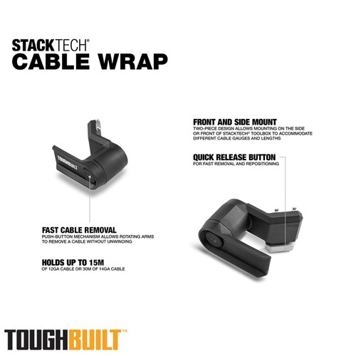 Keep your cords and power cables organised and tangle-free with the StackTech Cord Wrap. Designed for easy mounting on the side or front of your StackTech toolbox, this heavy-duty system simplifies cable storage and access. With a push-button mechanism for quick cord removal and a secure, quick-release design, the StackTech Cord Wrap keeps your workspace neat and efficient.