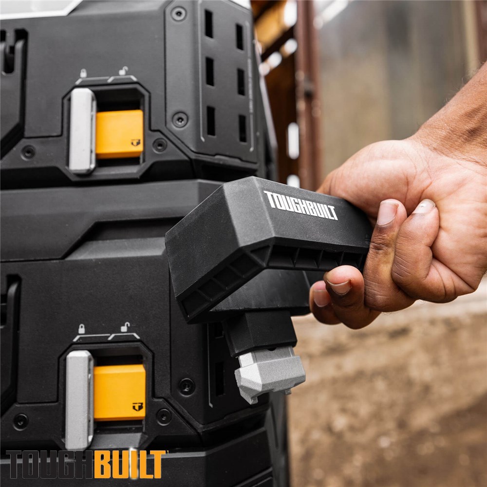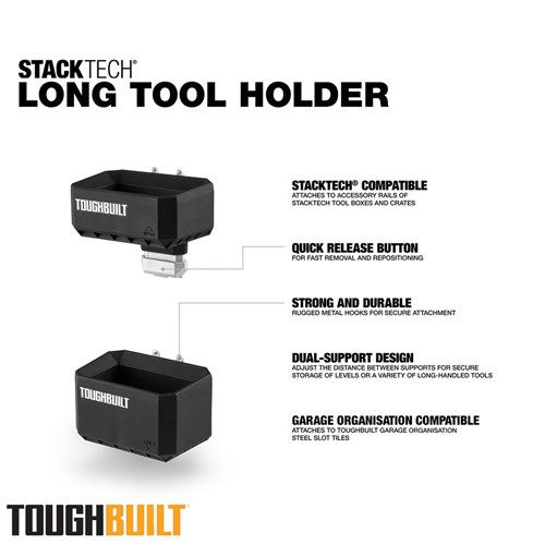 Keep your long-handled tools organised and within easy reach with the StackTech Long Tool Holder. Designed to clip easily onto the side of your StackTech toolbox or crate, it also integrates seamlessly with ToughBuilt Garage Organisation steel slot tiles. Its dual-support design securely holds levels, shovels, axes, and bars, while quick-release buttons and rugged metal hooks provide fast, reliable attachment.