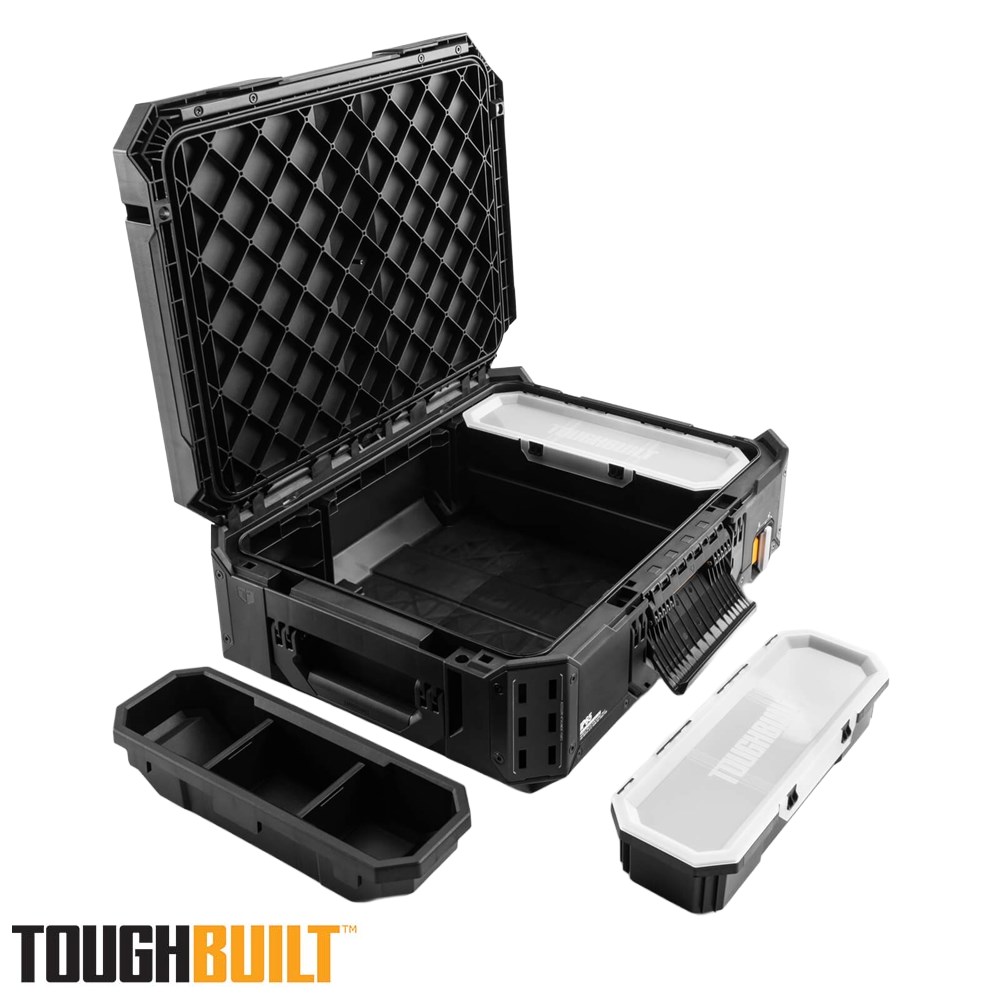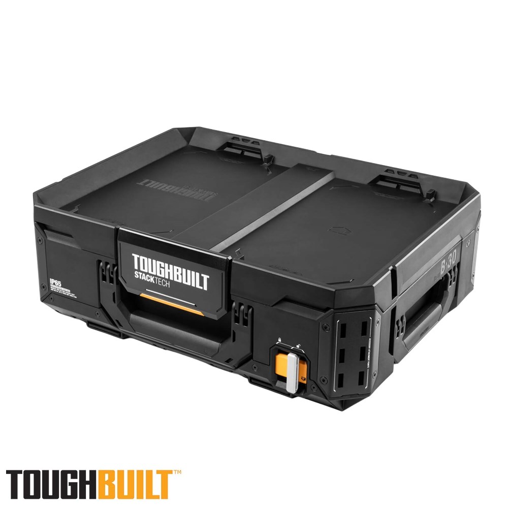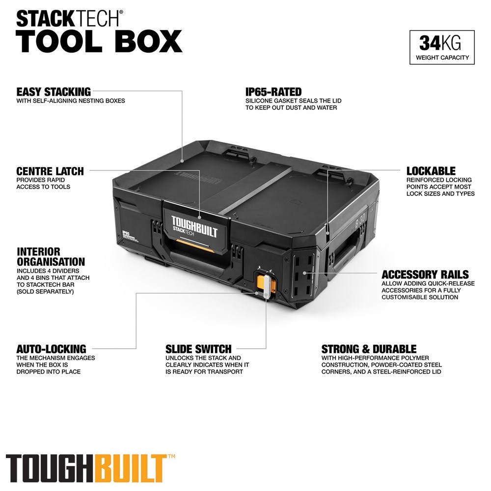 The StackTech Tool Box is a standard-capacity workhorse built for secure stacking, fast access, and pro-level durability. Its self-aligning top lets boxes and totes naturally nest, while the auto-locking interface clicks everything into place for transport. A one-handed centre latch makes tool access effortless, and the interior bins and dividers keep gear neatly organised. With steel-reinforced construction, IP65 protection, and tool-free accessory rails, this toolbox is engineered to customise any StackTech setup and tackle the toughest jobs.